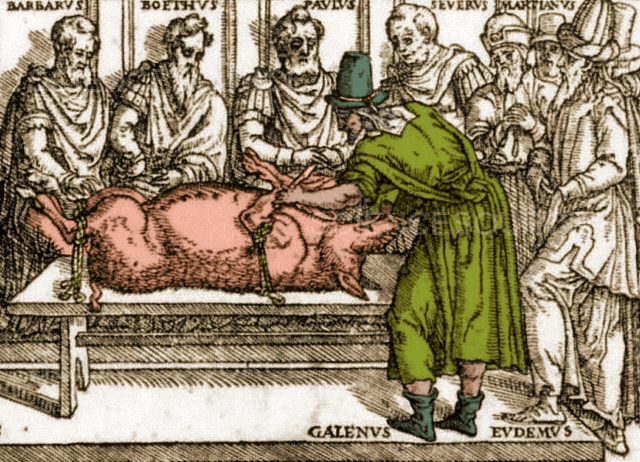 Developed by Galen, the “theory of demonstration” involved making careful observations and applying logic to discover medical truths. He conducted experiments on live animals, including oxen, horses, sheep, and swine, as well as on monkeys. A notable experiment included one on live pigs, where he cut nerve bundles one at a time to demonstrate which functions were affected by each one. The Galen’s Nerve, named after him, was the laryngeal nerve that was cut and caused the pig to stop squealing. His main practices were actually on pigs, as they were quite anatomically similar to humans. This was a public demonstration, and known as a vivisection experiment. Galen continued his careful observations. One of them being that the arteries carry blood rather than air, by differentiating the arteries from veins.